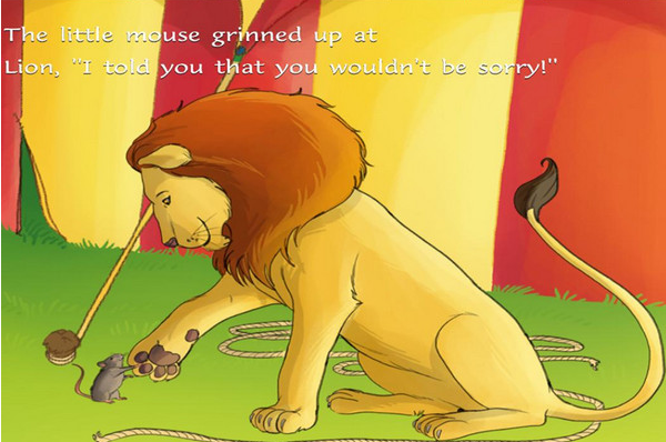 老鼠听到了他 的哀嚎,走过去咬断绳索,放走了狮子,并说:“你当时嘲笑我,不相信能得到我的报答, 现在可清楚了,老鼠也能报恩。” 这故事说明,时运交替变更,强者也会有需要弱者的时候。